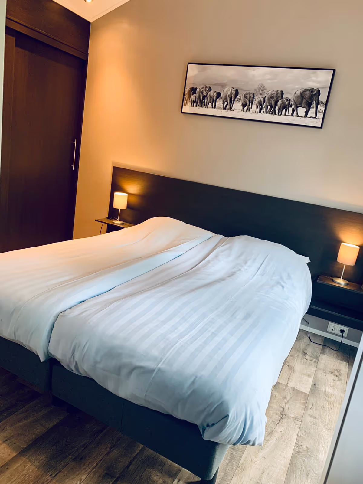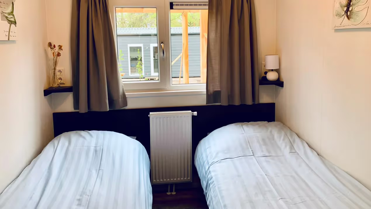 Dit 4-persoonschalet is voorzien van een grote slaapkamer over de gehele breedte van het chalet met daarin een 2-persoonsbed. Er is een tweede slaapkamer voorzien van 2 losse 1-persoonsbedden. Beide slaapkamers zijn voorzien van ruime kasten. De moderne badkamer heeft antraciet/bruine accenten, en voorzien van een mooie douchecabine, wastafelmeubel en toilet.