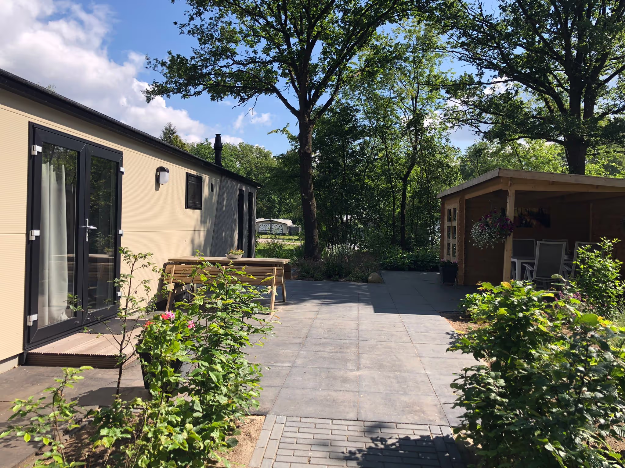 Binnen is het chalet voorzien van een luxe inbouwkeuken met moderne uitstraling, een gaskookplaat, afzuigkap, koelvriescombinatie en combi oven-magnetron. Een afwasmachine ontbreekt niet. Buiten is een mooi en groot verhard terras met een vrijstaande overkapping, voorzien van buitenmeubels. U kunt genieten van een prachtig uitzicht!